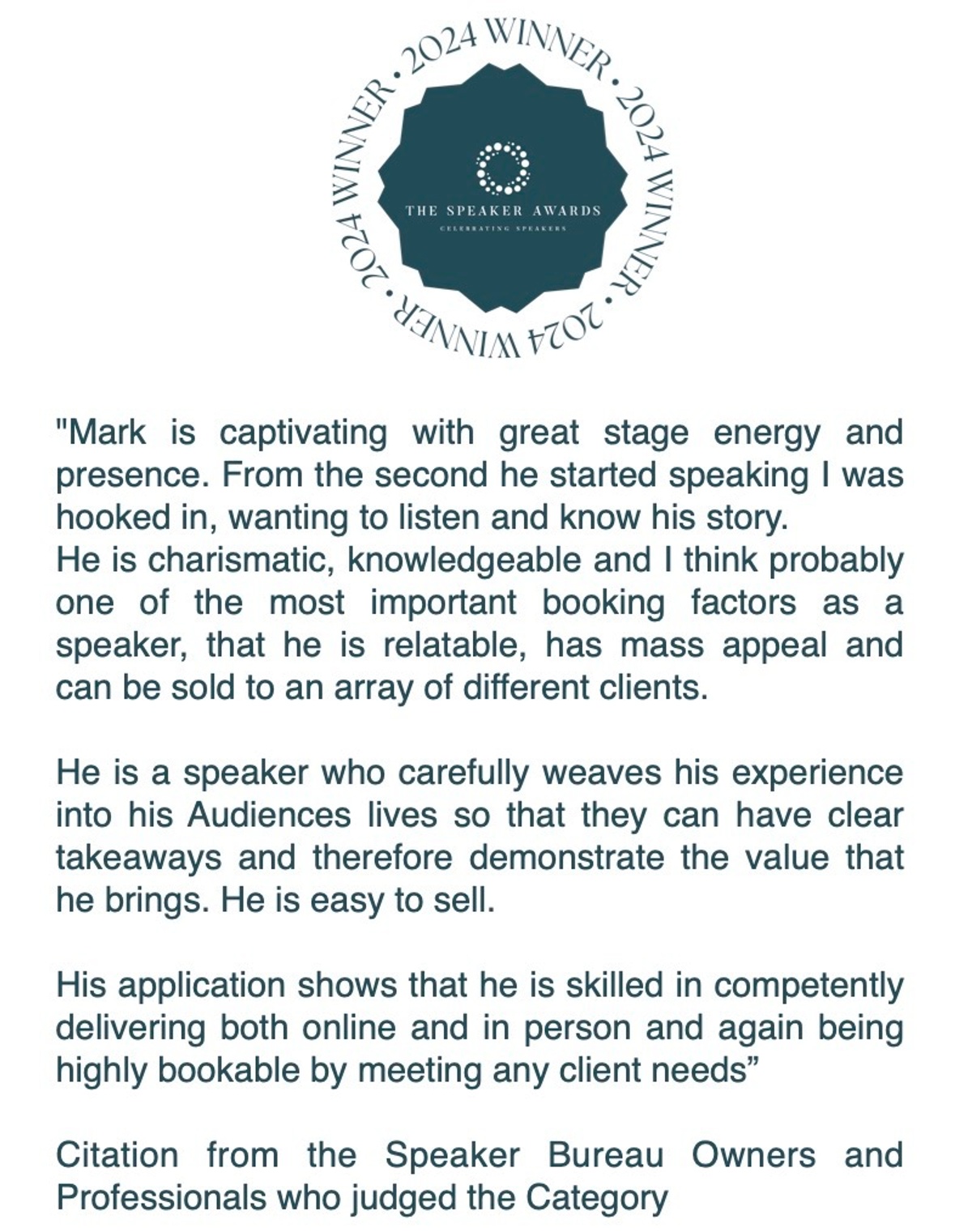 Mark Denton winning the 'Bookers Choice' Award 2024 at the Speaker Awards in London UK